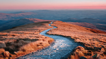A winding pathway through rolling hills during sunset, encapsulating the tranquil beauty of nature. This serene landscape invites exploration and reflects the peacefulness of the outdoor environment.