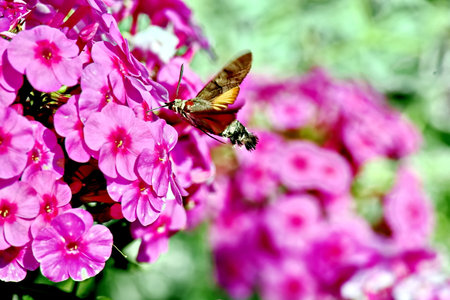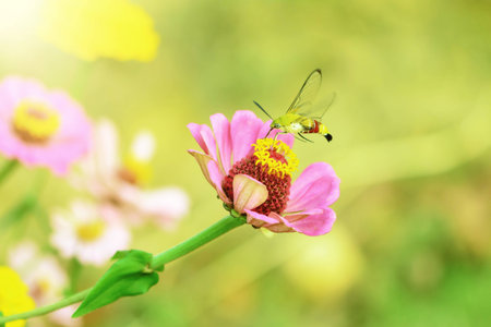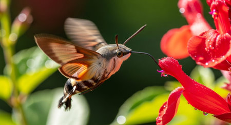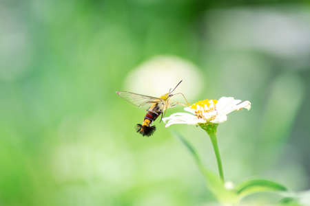 Broad-bordered bee hawk-moth in flight eats dahlia flower nectar in the flower bed