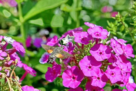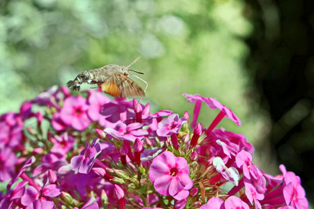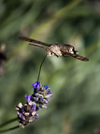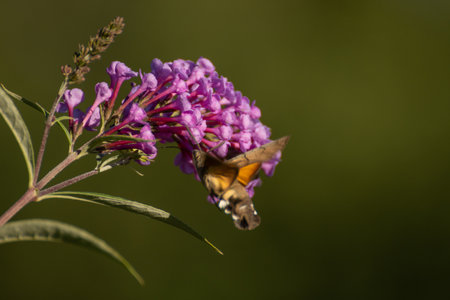 hummingbird hawk-moth (Macroglossum stellatarum) feeding on a purple flower.
