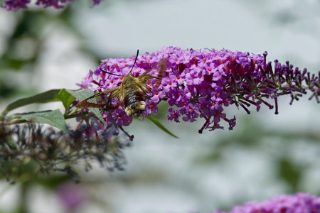 Broad-bordered bee hawk-moth (Hemaris fuciformis) in flight above summer lilac in Zurich, Switzerland