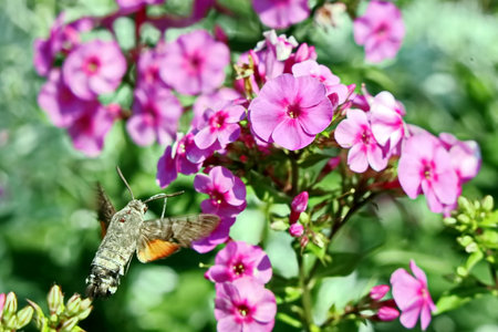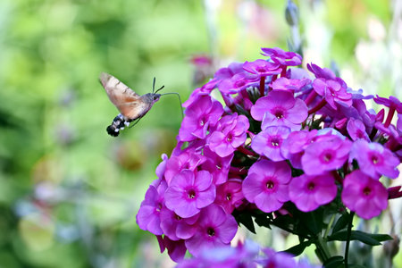 A hummingbird moth hovers delicately near a vibrant purple flower, gathering nectar under the warm sun in a lush garden. The scene captures the beauty of nature's pollinators and blooms.