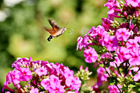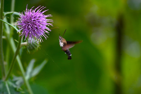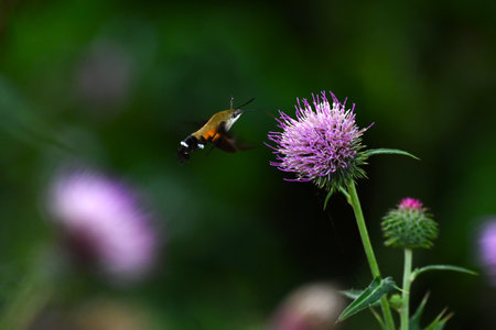 A Macroglossum pyrrhosticta sucking nectar from thistle flowers. Lepidoptera Sphingidae Insects. From early summer to late autumn, they hover from flower to flower, sucking nectar.