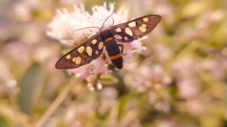 A closeup of a Maile Pilau Hornworm moth collecting pollen from flowers in a field in spring