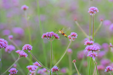 Hummingbird hawk moth (Macroglossum stellatarum) sucking nectar from purple flower (Verbena bonariensis)