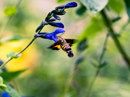 a broad bordered bee hawk moth (Hemaris fuciformis) feeding on a blue flower (Salvia pratense) in a forest in springtime