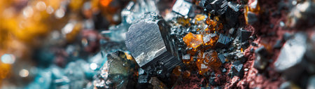 Beautiful Close Up View of Shimmering Black and Orange Crystal Formations in Rugged Rock Layers Under Natural Lighting in a Geological Environment. Generative AI