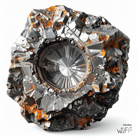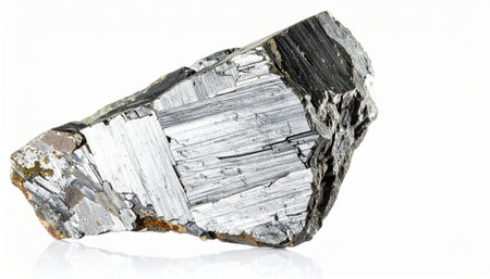 A single, unrefined specimen of a metallic mineral, showcasing its natural crystalline structure and brilliant, reflective luster. Isolated on a clean white background, this image highlights the raw beauty and industrial potential of geological resources, perfect for scientific, educational, or metallurgical themes.
