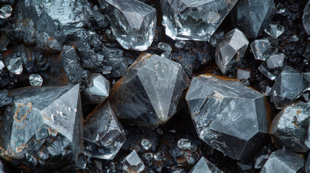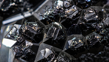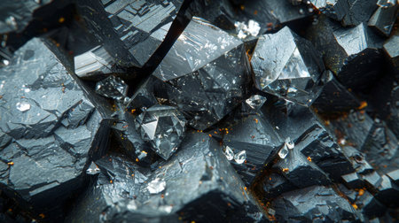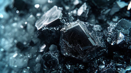 High resolution Close Up of Sparkling Black Crystals Glistening Under Light in a Dark Rocky Environment Showcasing Their Unique Geometrical Shapes and Textures. Generative AI