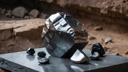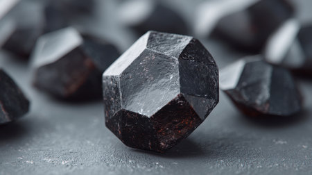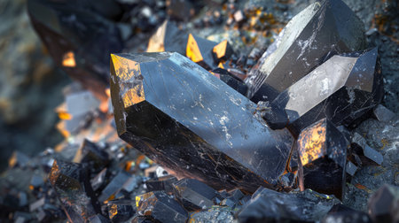 Close up View of Sparkling Black Mineral Crystals on Rocky Surface Showcasing Intricate Geometric Shapes and Textures in Natural Lighting. Generative AI