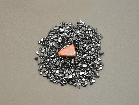 Numerous dark rocks with metallic textures are arranged against a warm orange background. The image exhibits a shallow depth of field, highlighting the rough surfaces and natural shapes. The composition features directional lighting and could be suitable for illustrating concepts related to geology or mineralogy, and could be utilized for various commercial purposes.