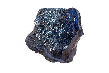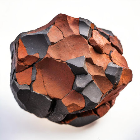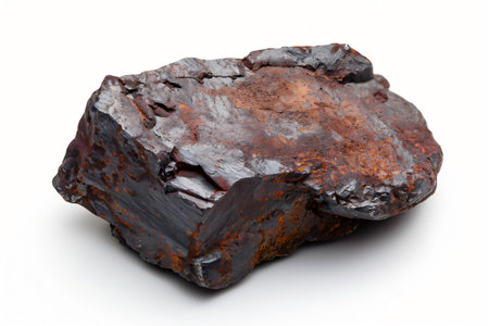 Piece of raw iron ore is laying on a white background, showing the oxidation process