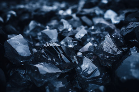 Macro shot of black obsidian stone, sharp and glassy with smooth surfaces, reflecting light in a sleek and mysterious manner.