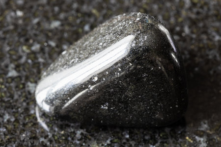 sample of tumbled schorl black tourmaline mineral on black granite background close up from Madagascar