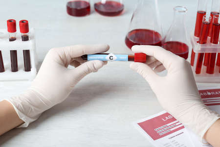 Scientist holding tube with blood sample and label Hepatitis C test at white wooden table, closeup