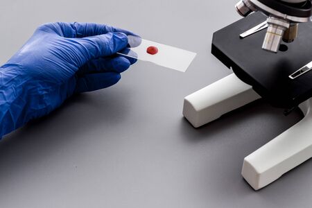 Blood testing with microscope in laboratory. Sample in hands on grey background
