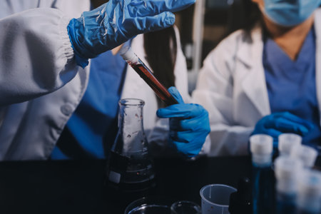 Gloved hand holding two test tube with red liquid, laboratory glassware and rack in blurred background showing clinical experiment and analysis