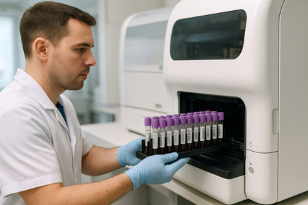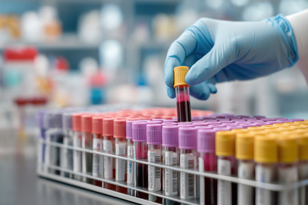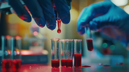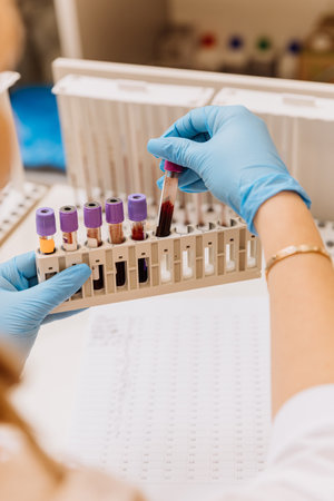 Laboratory technician handling blood samples in test tubes for analysis and diagnostics