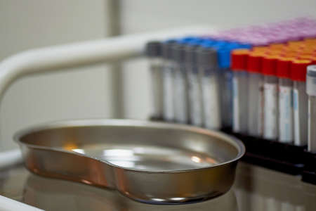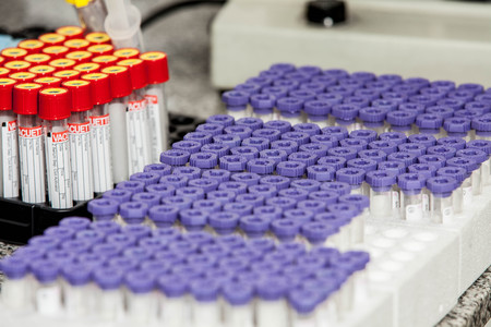 Milan, Italy - November 18, 2020: Sorting of blood tubes in a rack in the analysis laboratory
