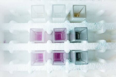 Close-up of scientist taking samples in the lab from test tubes with purple liquid