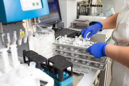 Medical equipment blood sample tube from a rack with analysis in the lab test in the research laboratory