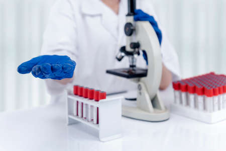 hands of a technician holding blood tube sample in the lab / doctor holds a blood sample tube in his hand testing in the laboratory.