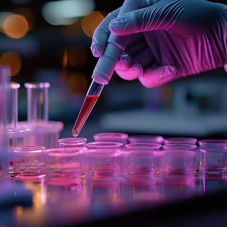 Medical laboratory. A hand in a medical glove pours blood into a petri dish for analysis. Laboratory tests