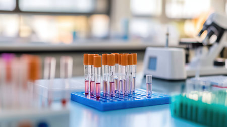 Rows of blood sample tubes with vibrant colored caps are neatly organized in a rack, showcasing a clinical environment focused on medical testing.