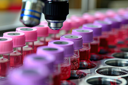 A row of test tubes with purple lids are neatly lined up on the laboratory shelf, creating a colorful display of violet and magenta hues