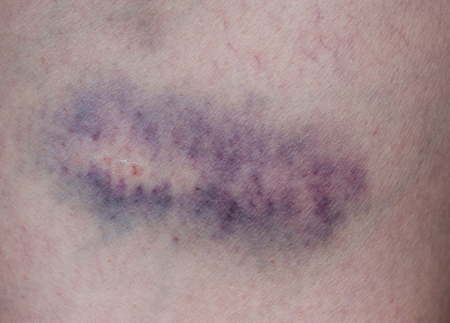 Purple bruise on leg caused by Wrapping elastic bandages too tightly after knee surgery
