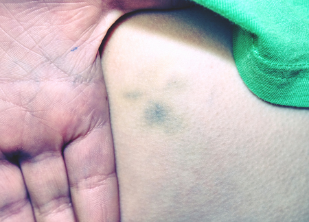 Green blue bruise after an accident. Back of kid. Kid palm and fingers