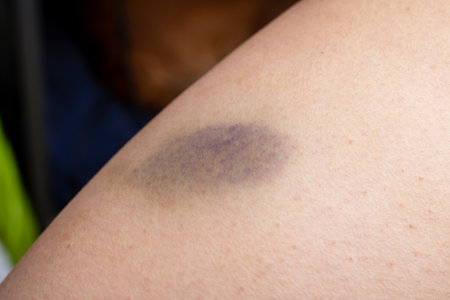 A close up view of a bruised elbow reveals discoloration and swelling from recent impact showcasing the bodys healing process.