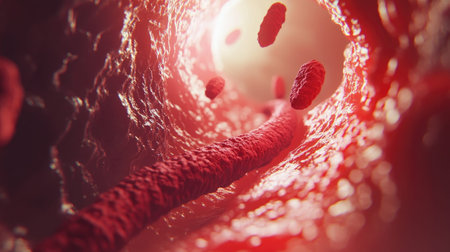 3d illustration of red blood cells inside an artery, vein. The flow of blood inside a living organism. Scientific and medical microbiological concept. Enrichment with oxygen and important nutrients.