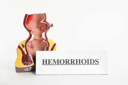 Anatomical model of rectum with card Hemorrhoids isolated on white