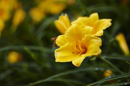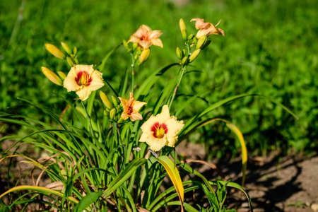 Beautiful yellow daylily flowers in the garden in summer.