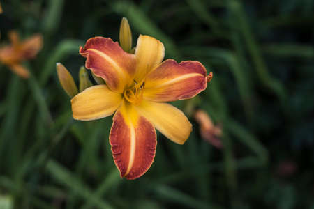 Orange and yellow flower of Hemerocallis or Daylily in a garden.