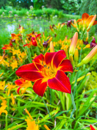 Vibrant red and yellow daylilies bloom beautifully against the lush greenery surrounding a tranquil pond, showcasing natures exquisite beauty in rich, vivid detail