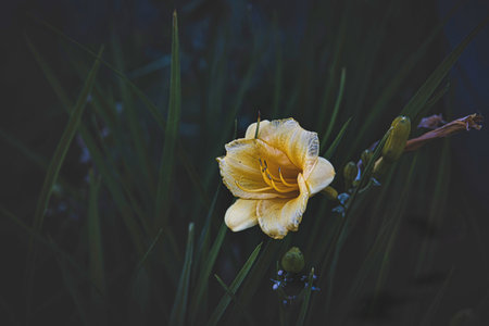 A soft yellow daylily stands out against a dark, muted background