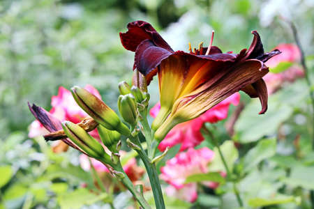 burgundy flowers of purple daylily close-up in the garden. natural background of flowers.