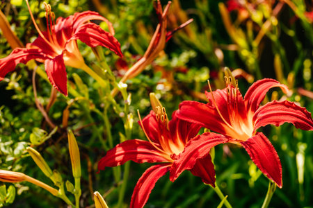 Vivid orange flowers of Hemerocallis Lilium or Lily plant in a British cottage style garden in a sunny summer day, beautiful outdoor floral background photographed with soft focus