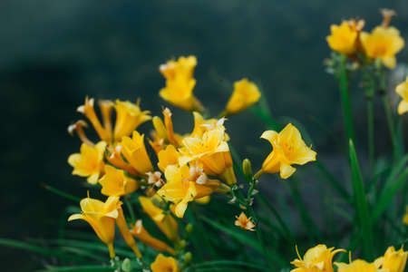 Beautiful yellow delicate lilies on a flower bed in the garden. Beautiful floral background for the designer. Copy space.