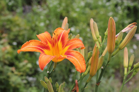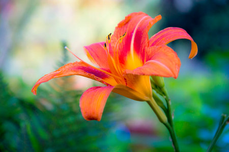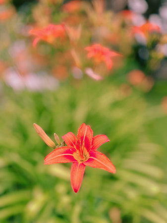 One vivid orange flower of Hemerocallis Lilium or Lily plant in a British cottage style garden in a sunny summer day, beautiful outdoor floral background photographed with soft focus