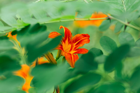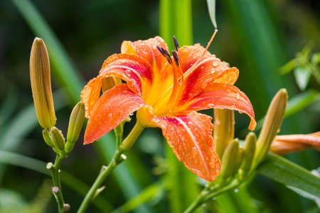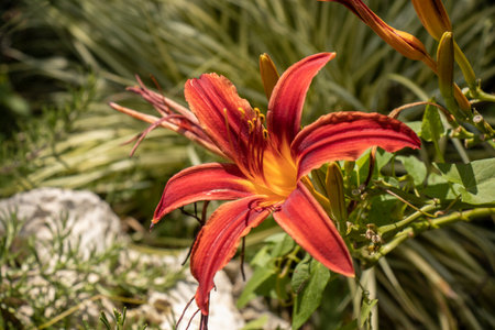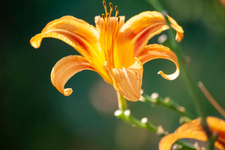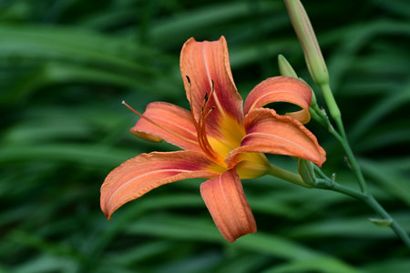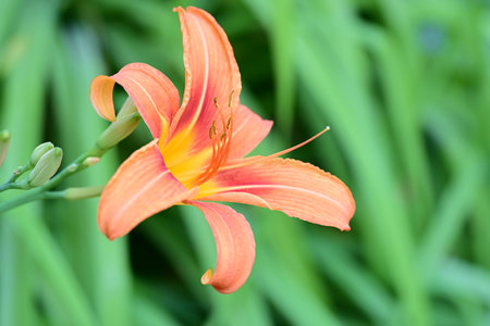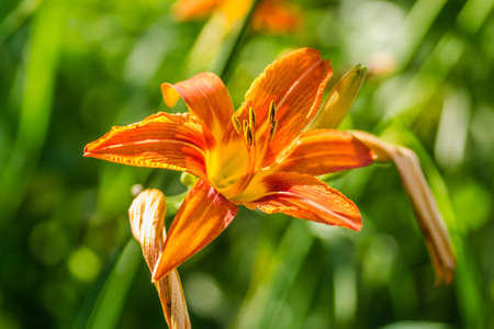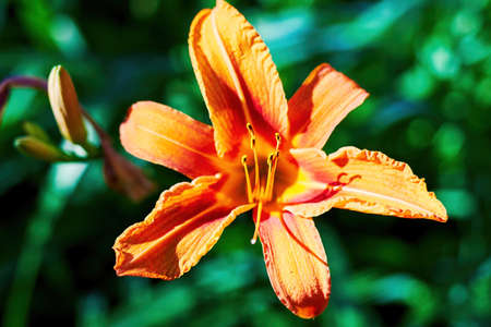 Close-up of an orange daylily flower Hemerocallis blooming in the garden. Bright summer blossom on a green background. Natural floral beauty, shallow depth of field, and soft sunlight.