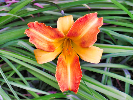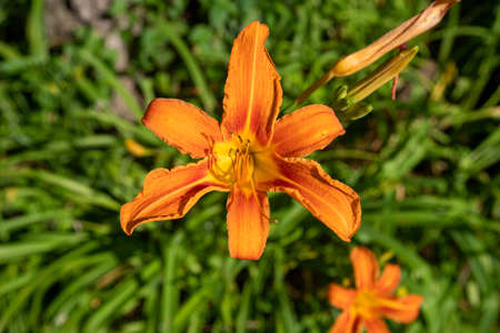 Single orange day lily (Hemerocallis fulva) in the green grass, close up detail, top view. Beautiful ornamental flower