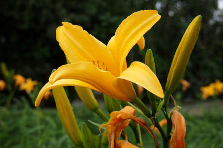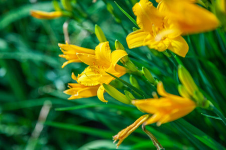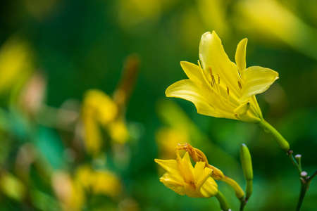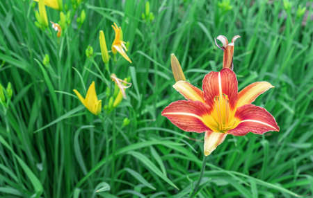 Flower beds with flowers in summer garden. Yellow daylily flower (Latin: Hemerocallis) on green leaves background, close up. Selective focus.