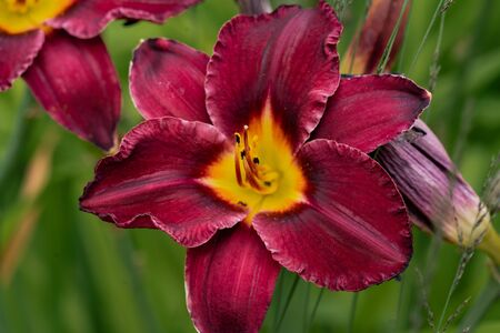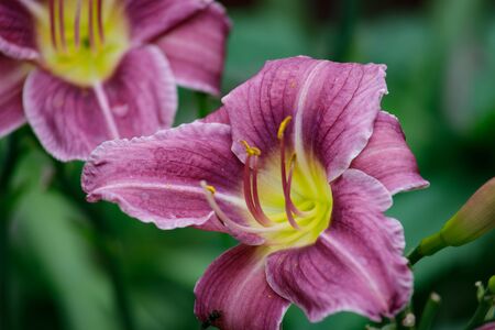Purple lily or hemerocallis flowers in the garden. Flowers bloom in summer. Tongue flower coquetry.