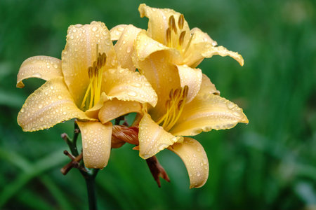 Beautiful light orange flowers daylilies close up on green background. Blooming Hemerocallis On And On.