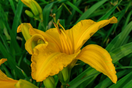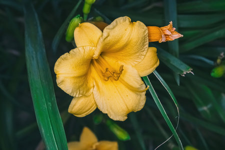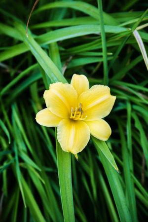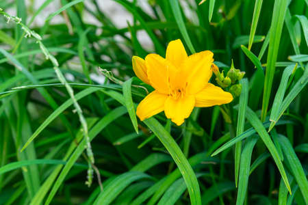 daylily yellow flower on a background of leaves