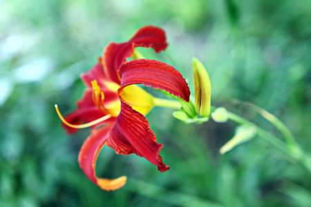 colourful red day lily flower head against a green bokeh background with glorious pistils