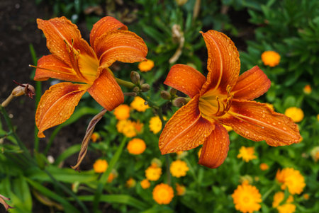 Orange lily flowers in a private garden.