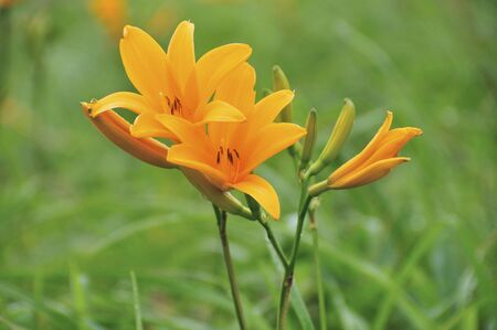 Daylilies blooming with orange flowers - Hemerocallis, in the summer garden